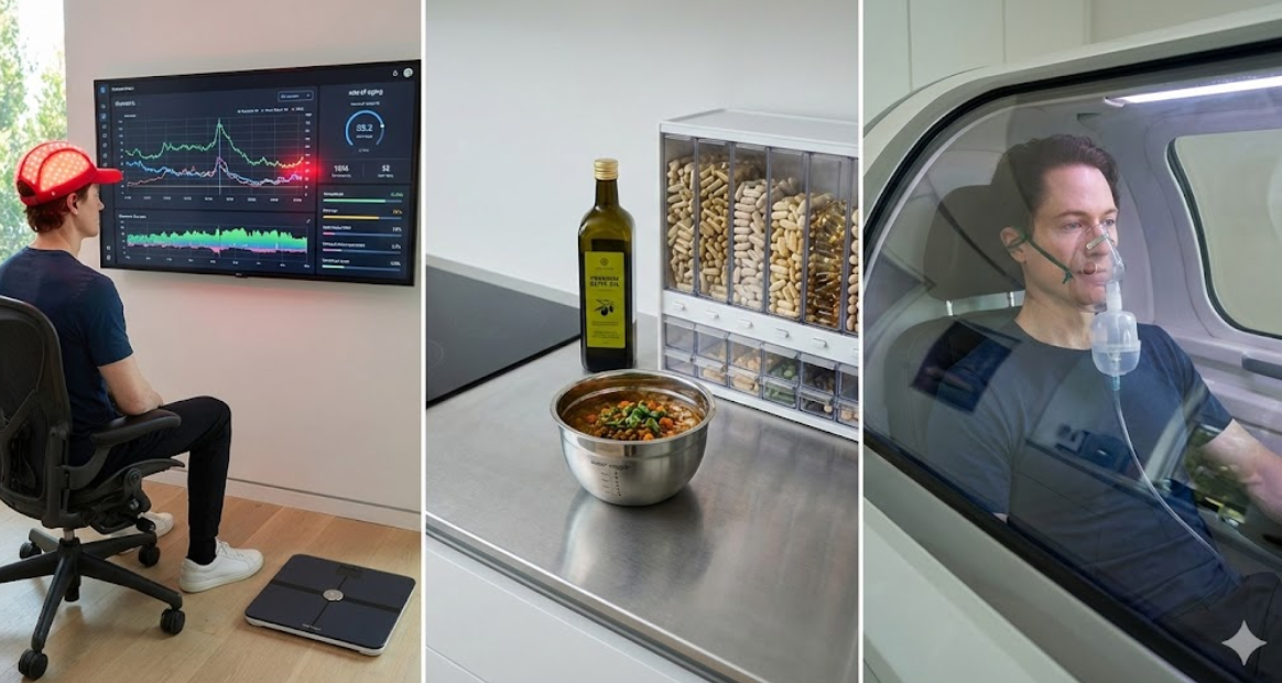 오전 5시 20분, 그는 주방으로 가서 역삼투압 시스템으로 정화되고 재광화된 물 한 잔을 따릅니다. 이 물은 LA 수돗물에서 미세 플라스틱, 중금속, 제약 잔류물을 제거한 것입니다. 이 물로 그는 Blueprint 장수 혼합물을 만듭니다. 이 혼합물은 예전에 먹던 12알 정도의 약을 대체하며, 콜라겐 생성을 위한 글리신, 뇌와 근육 성능을 위한 크레아틴, 염증 및 미토콘드리아 기능을 위한 CAKG를 포함합니다. 그는 아침에 40가지 비타민을, 오후에 또 40가지를 먹으며, 필수 캡슐, 고급 항산화제, 아슈와간다, 로디올라를 포함한 추가 보충제를 함께 섭취합니다. 이러한 극단적인 루틴은 일반인이 따라 하기에는 현실적 장벽이 높지만, 그의 노화 속도 측정값이 0.48을 기록하며 정상보다 50% 더 느리게 나이를 먹고 있다는 결과는 주목할 만합니다.