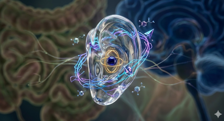 전정시스템(Vestibular System)은 우리 귀 안쪽 반고리관(Semicircular Canals)에 위치한 균형 감각 기관입니다. 여기에는 작은 칼슘 결정들이 들어 있어, 머리가 움직일 때마다 중력 방향에 따라 굴러다니며 신경 신호를 보냅니다. 이 신호는 소뇌(Cerebellum)로 전달되고, 소뇌는 다시 도파민·노르에피네프린·아세틸콜린을 분비하는 뇌 심부 핵으로 출력을 보냅니다.